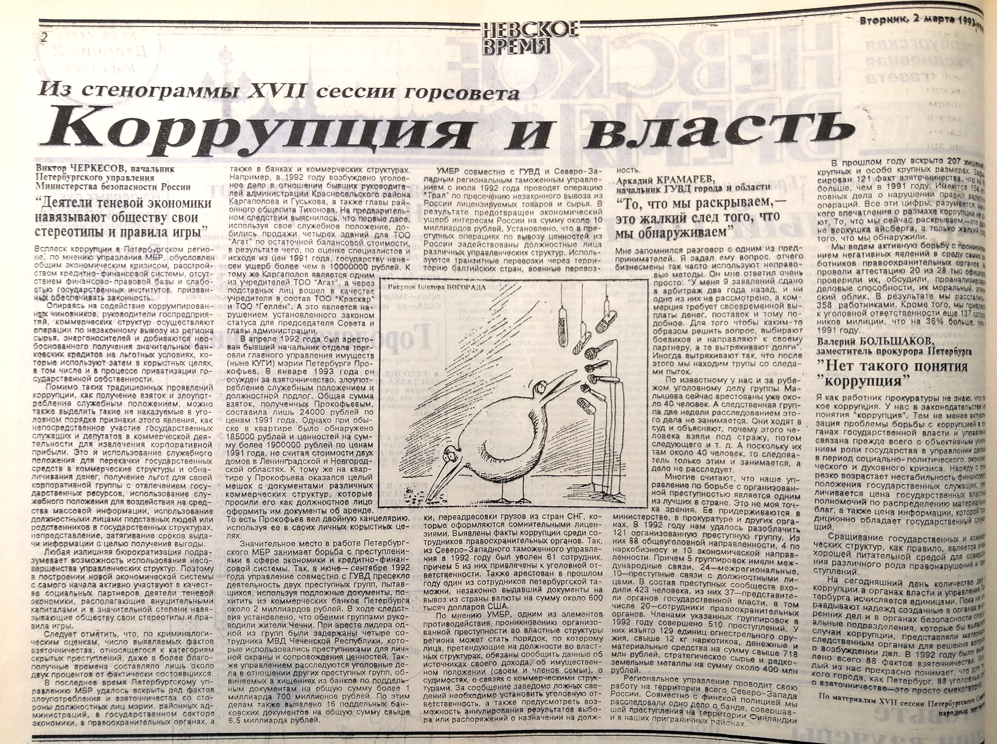 В 1992 году министерство внутренних дел выявило в Петербурге 88 фактов взяточничества. "Для такого города, как Петербург, – это просто смехотворно", – говорил заместитель прокурора города на слушаниях в Петросовете. Семь дел рассматривались в отношении сотрудников мэрии. По одному из этих дел Алексей Леонардов оказался в СИЗО. Что случилось с остальными шестью фигурантами дел о взятках в мэрии – общественности не было известно ни тогда, ни сейчас и вряд ли станет известно вообще.