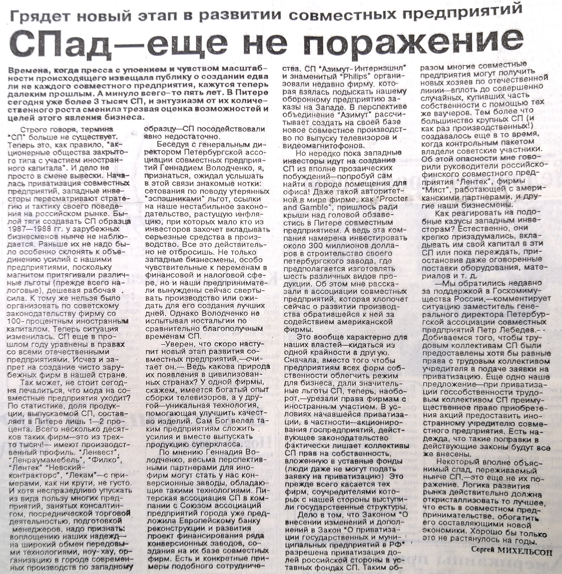 К концу 1991 года в городе было зарегистрировано уже около 300 СП со средней долей иностранного участия в 60%, говорится отчете комитета по внешним связям, копию которого авторы расследования получили в Госархиве. В 1993-м их было уже более 3 тысяч, однако доля СП в городском производстве не превышала 1-2%, писала газета "Невское время". "Воплощению наших надежд – на широкий обмен передовыми технологиями, ноу-хау, организацию современных производств по западному образцу – СП не поспособствовали", – отмечало издание.