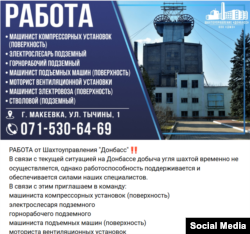 О реальном положении дел могут свидетельствовать и объявления о работе. Здесь не скрывают: шахта (по этому адресу находится "Щегловская") временно не добывает уголь, но ее работоспособность надо поддерживать.