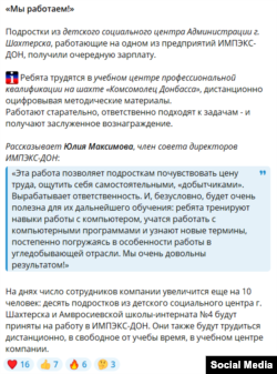 На шахтах "Импэкс-Дон" пытались преодолеть сложности с недостатком рабочих рук привлечением людей из Кузбаса – видимо, эта стратегия себя не оправдала. К работе привлекали даже подростков. Компания "Импэкс-Дон" на шахту "Комсомолец Донбасса" приглашала воспитанников детского социального центра в Шахтерске и Амвросиевской школы-интерната – для дистанционной оцифровки методических материалов с возможностью получать за это зарплату.