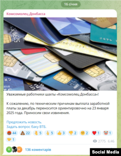 Вот, например, одно из сообщений из телеграм-канала шахты "Комсомолец Донбасса". Заработную плату за декабрь обещают выплатить в конце января. Задержку объясняют "техническими причинами".