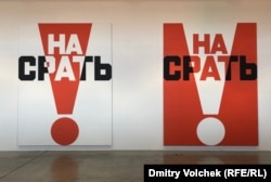 – Если работа живая, если она живую проблему затрагивает, то естественно, что каждый по-своему вправе на это реагировать. Не хочу сказать, что вы правы или не правы – это ваше право так считать. Для меня вопрос тут ставится просто в самозащите. Я немножко жалею, что уже открылась эта выставка, потому что цикл еще не закончен. Я только сейчас делаю последнюю, самую важную работу, которая, как мне кажется, всё объяснит окончательно. Вся эта серия должна называться "Формула самозащиты". Я вижу, как моим сознанием манипулируют со всех сторон, – и здесь, и в России – это абсолютно то же самое. Мое сознание превращают в инструмент, при помощи которого они хотят, чтобы оно что-то делало для массовой культуры. Это печать, это телевизор, но не только. Сейчас глобальная стала манипуляция, потому что тут и медицина, и просто конкуренции всякие приводят к тому, что нас стараются лишить индивидуальности, стараются подчинить трафаретам, которому мы должны следовать. В сущности мы же информации не имеем, мы получаем просто инструкцию, что мы должны думать по поводу какого-то события, как мы должны себя вести, на что не надо обращать внимание, а на что надо. Вот чтобы сохранить свое человеческое достоинство, свое право на собственное мнение, нужно делать свое дело максимально добросовестно и никак не реагировать на это наружное массовое воздействие. Вот "насрать".