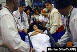 Не стоит пугаться, на этом фото – всего лишь инсценировка похоронной процессии. В гробу также лежит актер. На выставке демонстрировали свое мастерство лучшие похоронные бригады России.